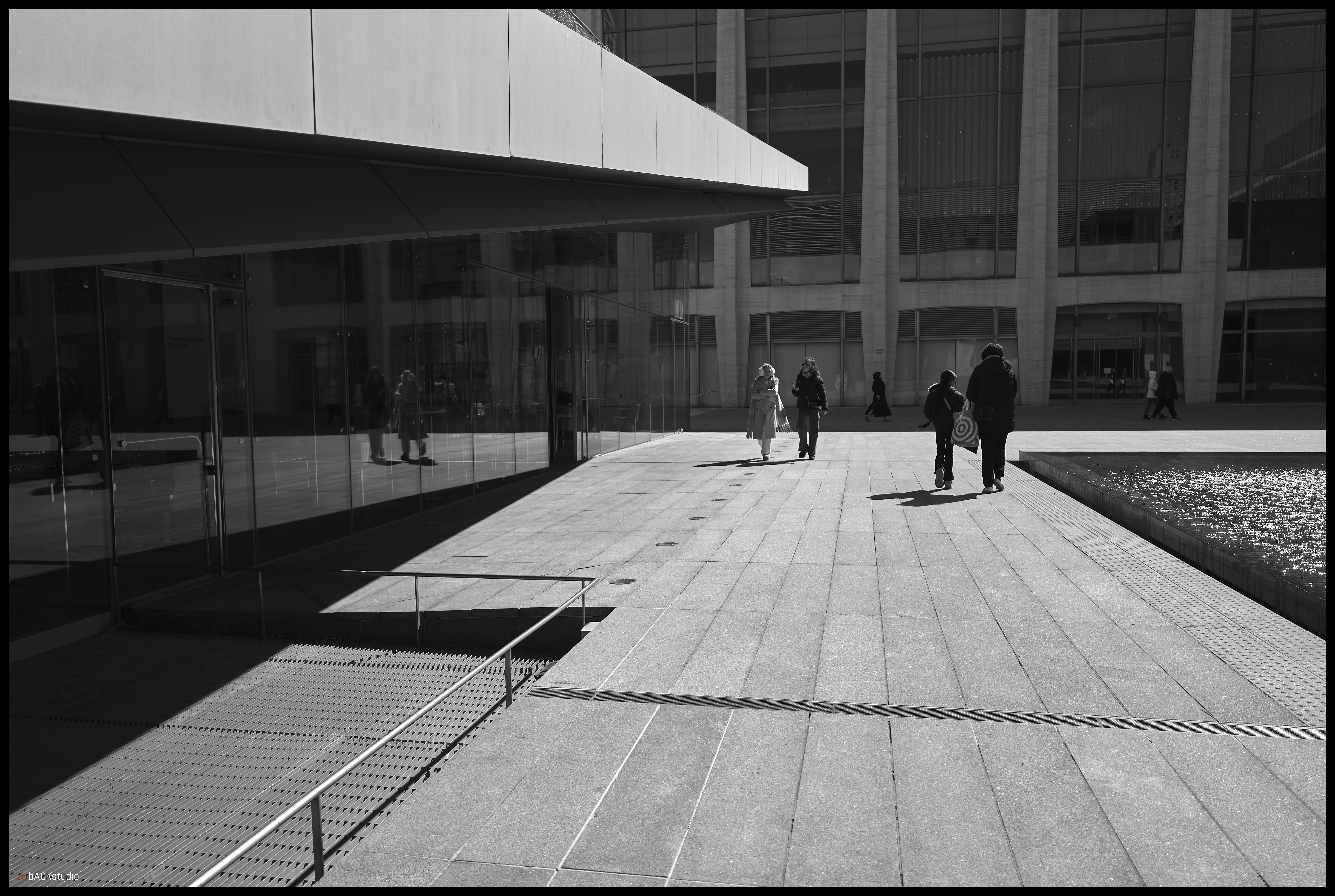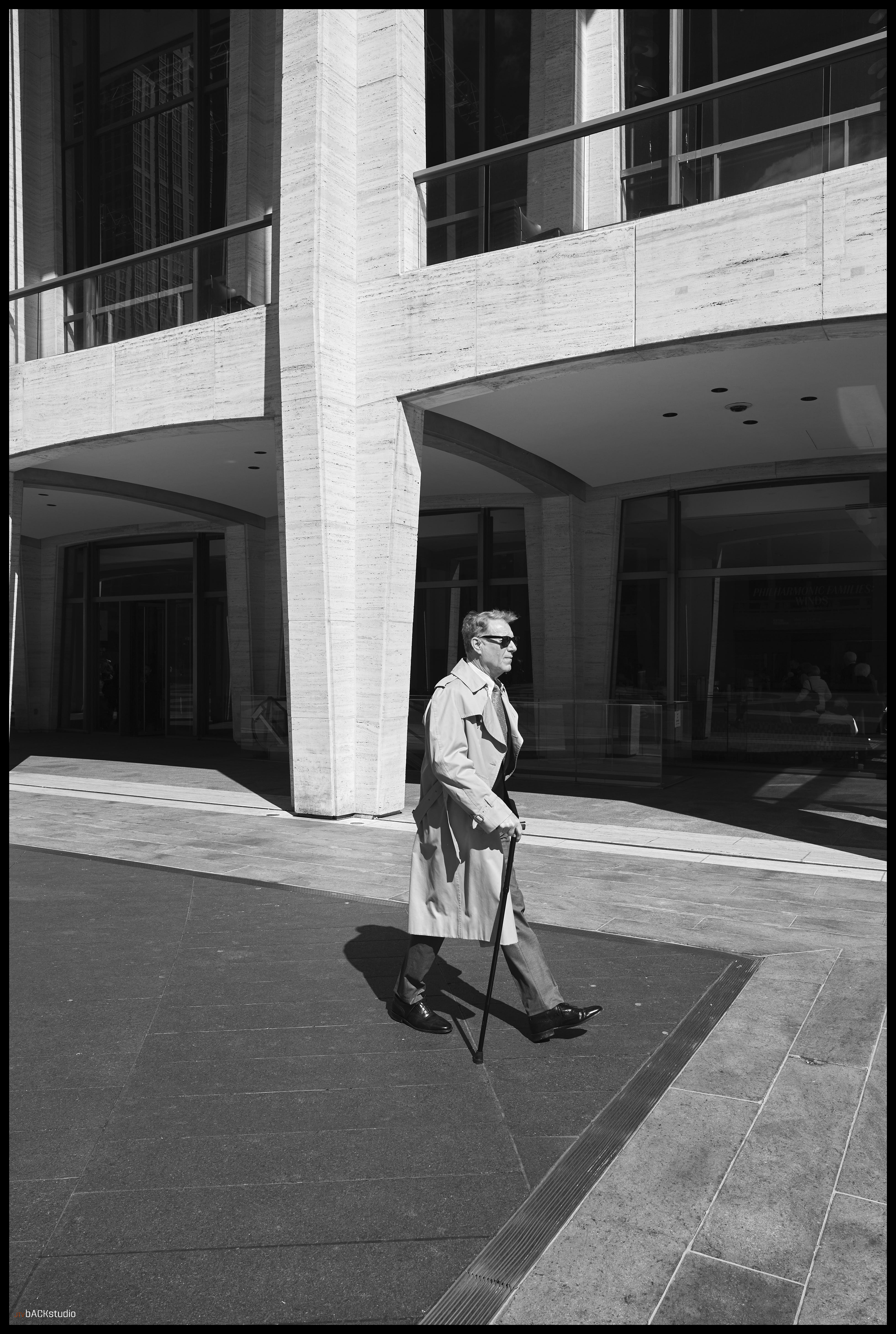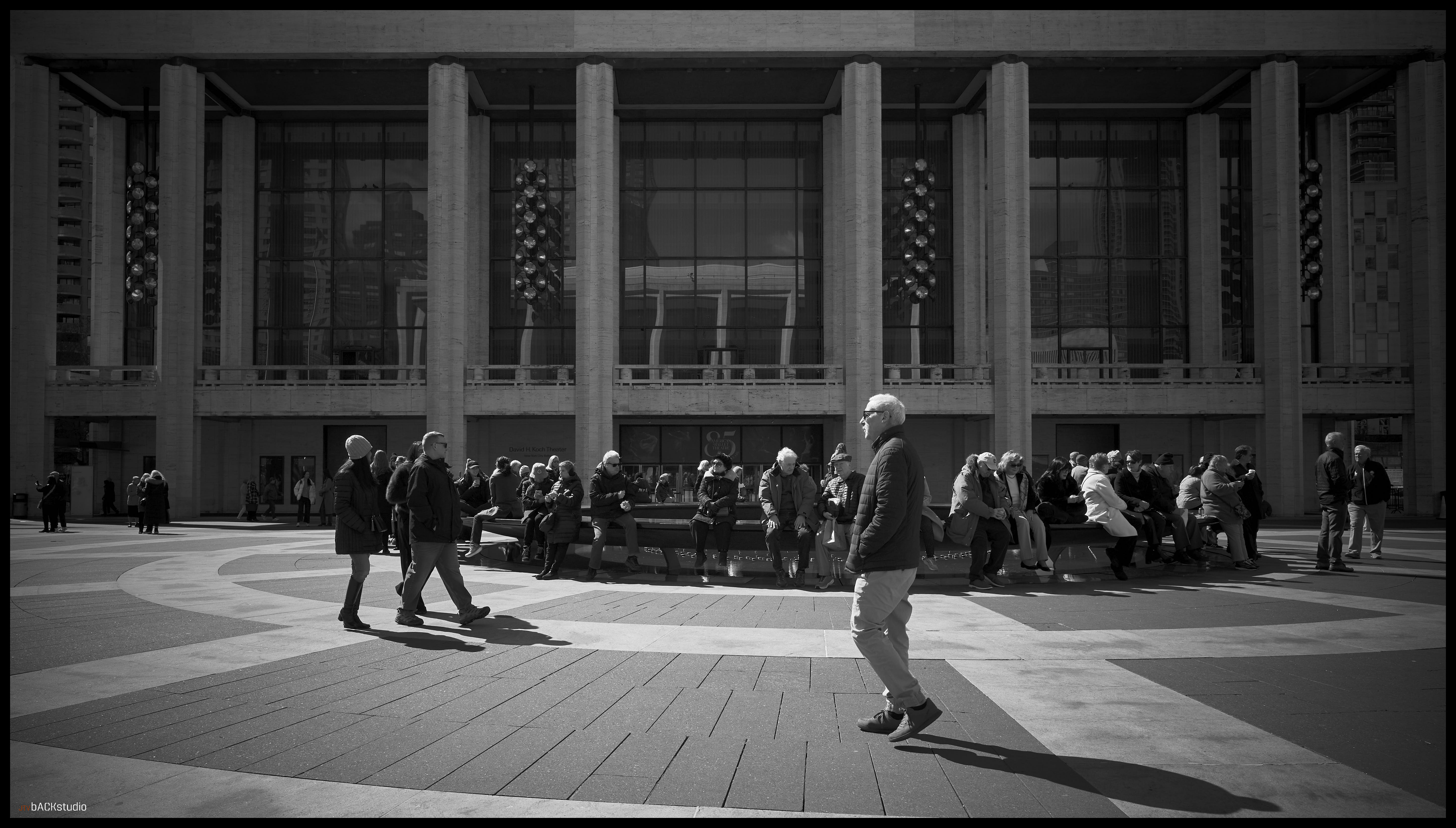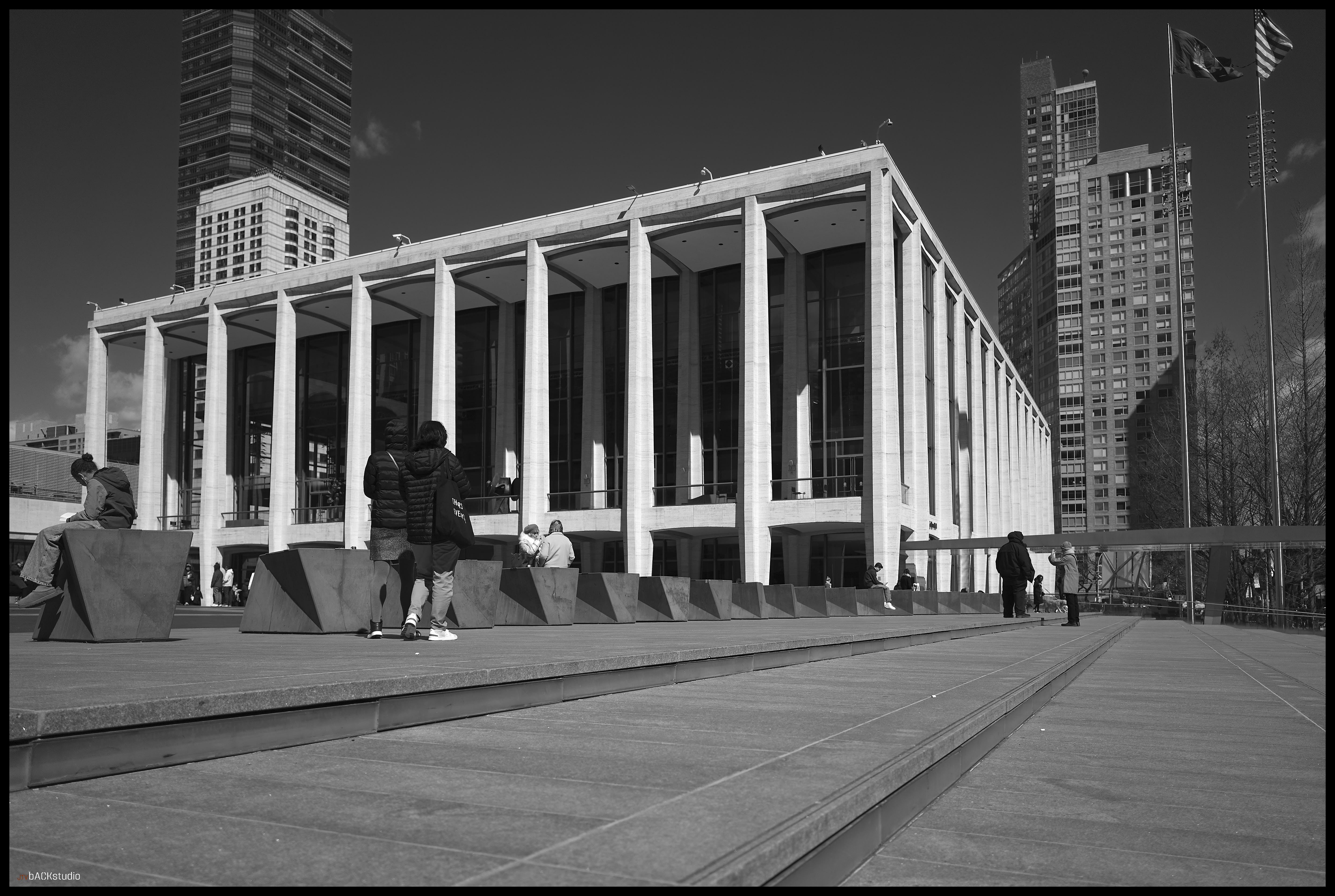 The bus arrived early, and as a result, left about 40 minutes to explore Lincoln Center and the surrounds of New York City. I chose to remain within the immediate area of the complex and examine street photography from the perspective of exploring architectural geometries and pedestrians in adjoining spaces. Color and black/white photos were used to create stark contrasts between facades, people, geometries and scale. Considering its simple symmetrical layout of buildings, there is much to be seen besides the performances at Lincoln Center. Its core is a series of three buildings, deceptively simple in configuration, which combine to create a dynamic interaction between the pedestrian and the geometry of space. Dynamics are further achieved by the elevation change from sidewalk to plaza, from landscape features and elements which must be negotiated by the pedestrian within the plaza, from multiple access points to adjoining streets and additional buildings on the Lincoln Center campus located off-axis but geometrically aligned with the orthagonal grid of the 3 main performance halls. they are temples, whether to American Exceptionalism or not, is left to your interpretation. They are not, however, innocent in their creation.
