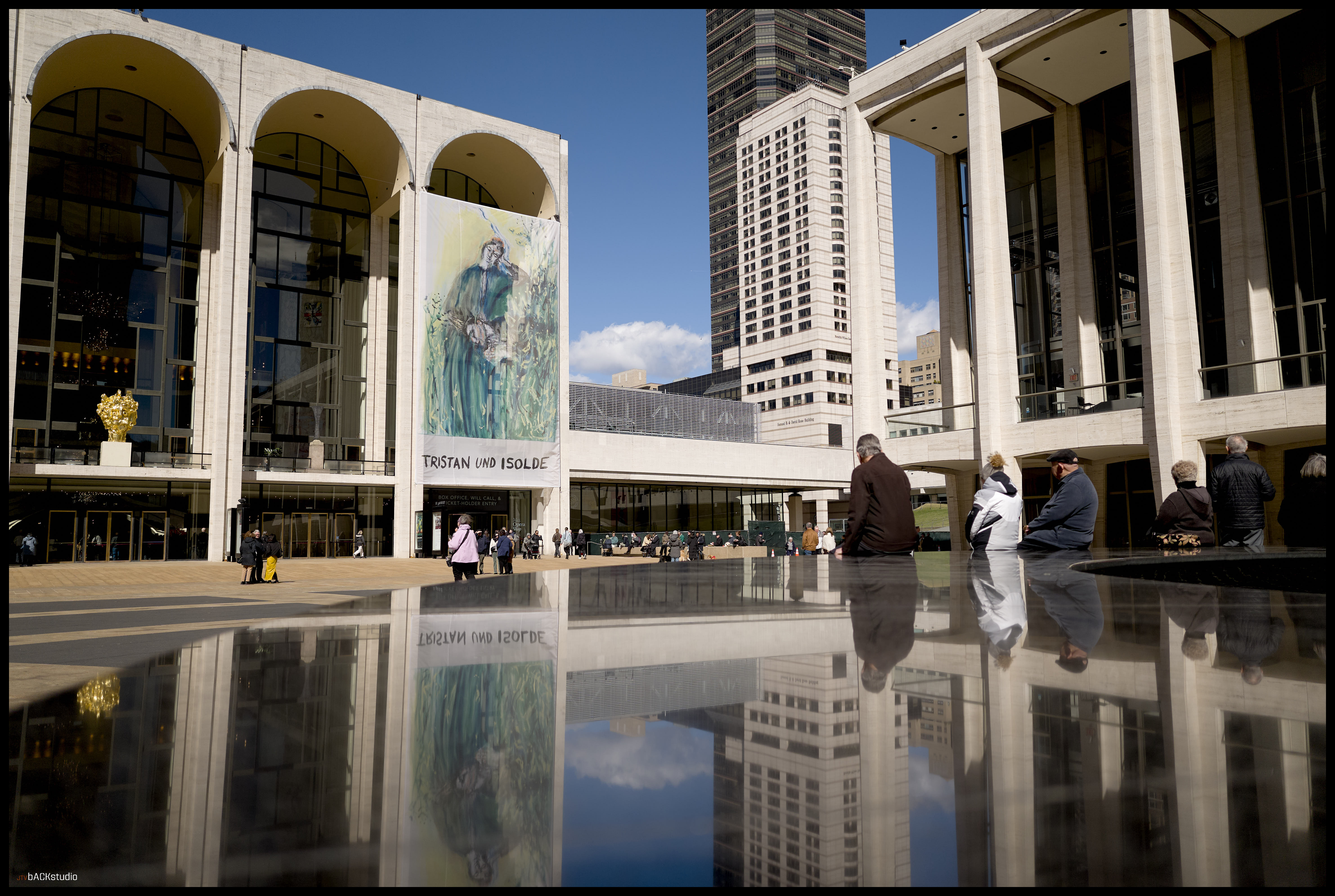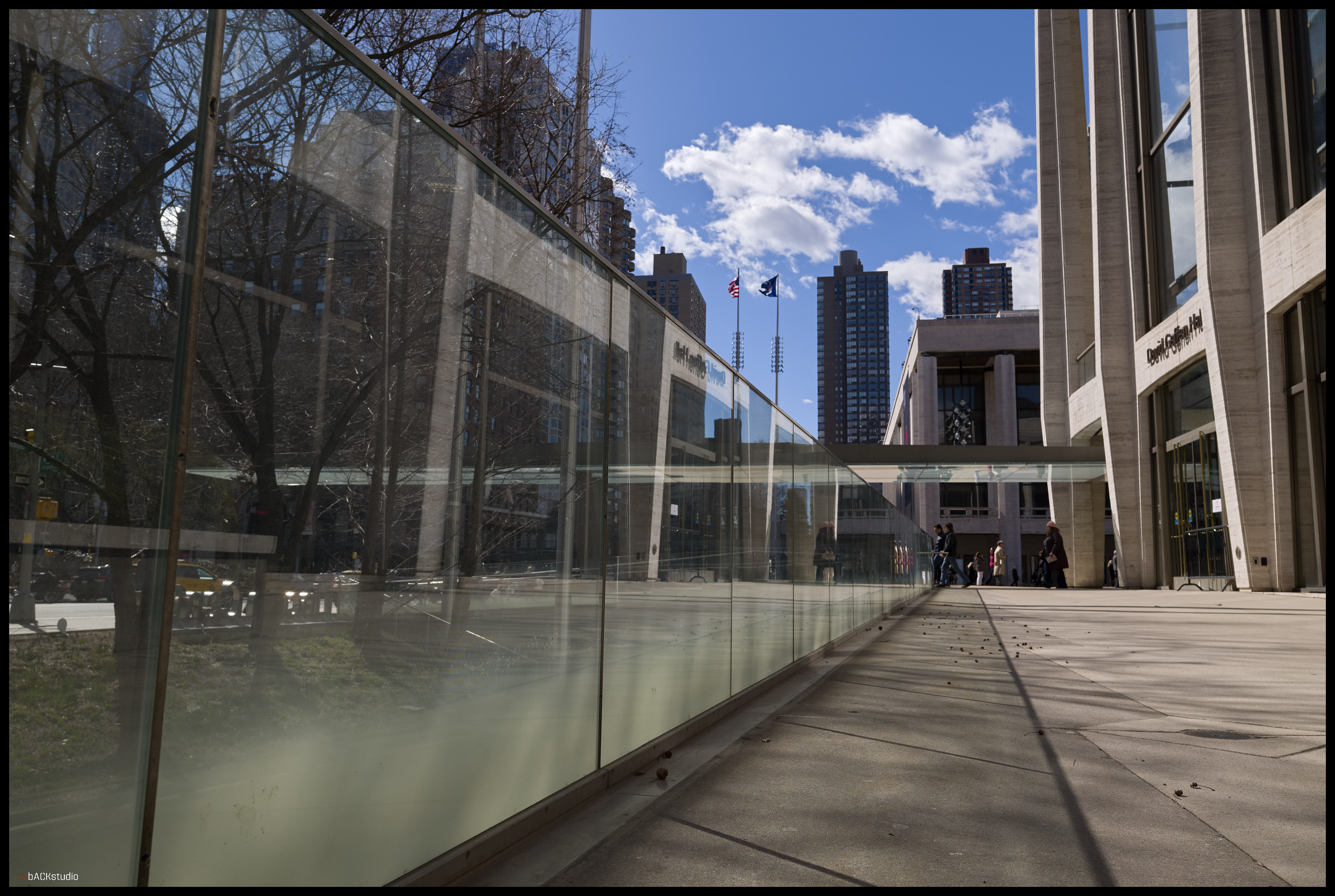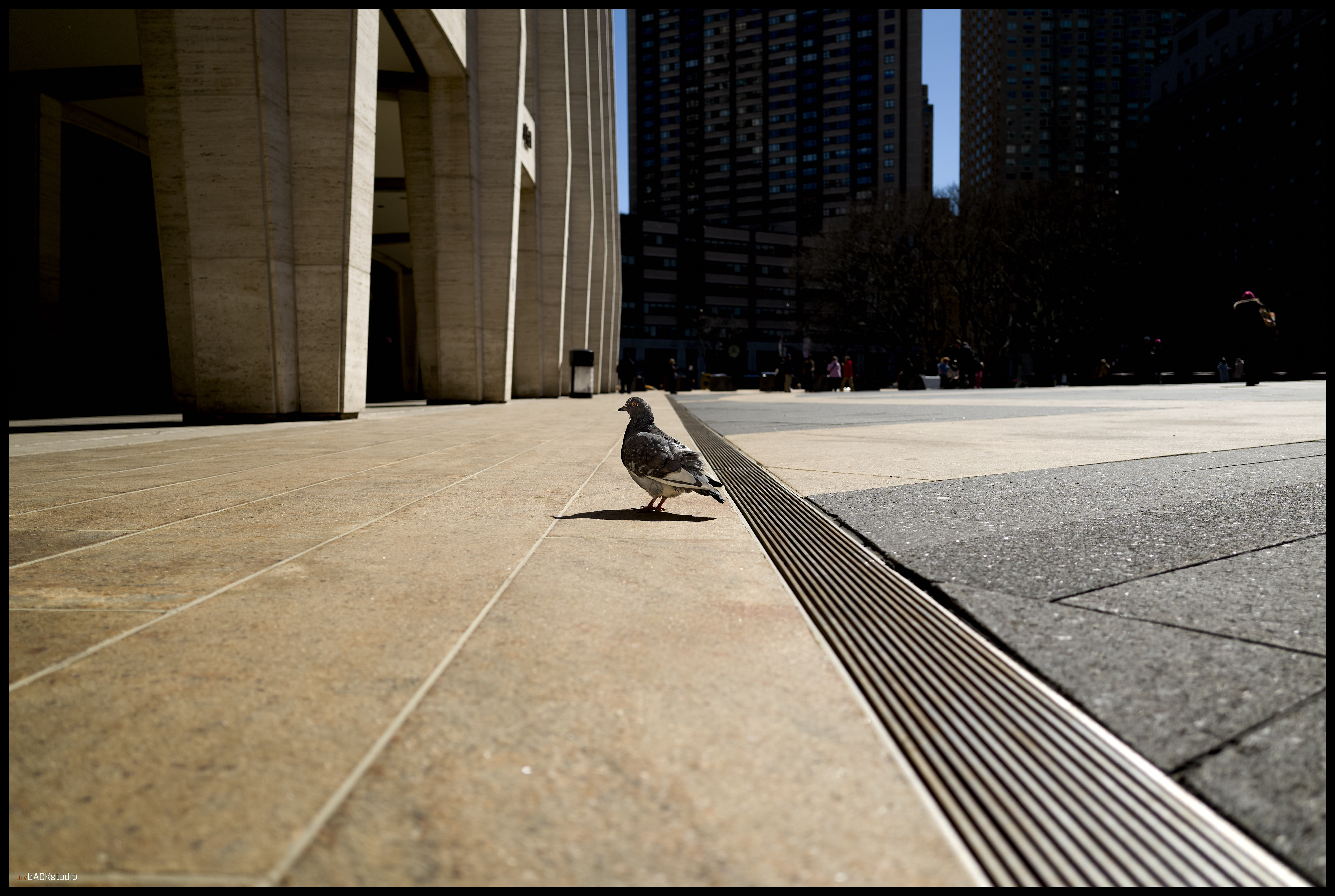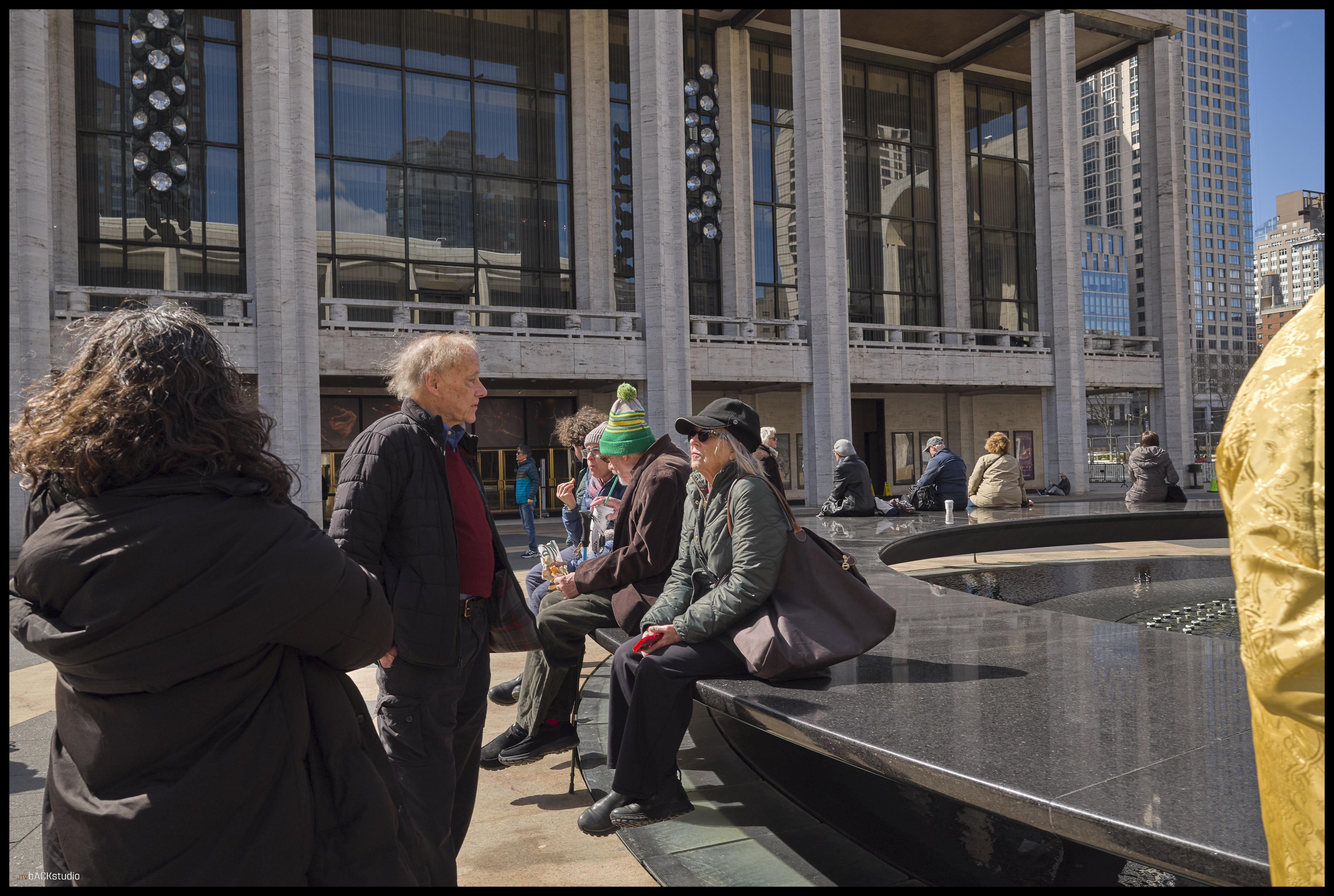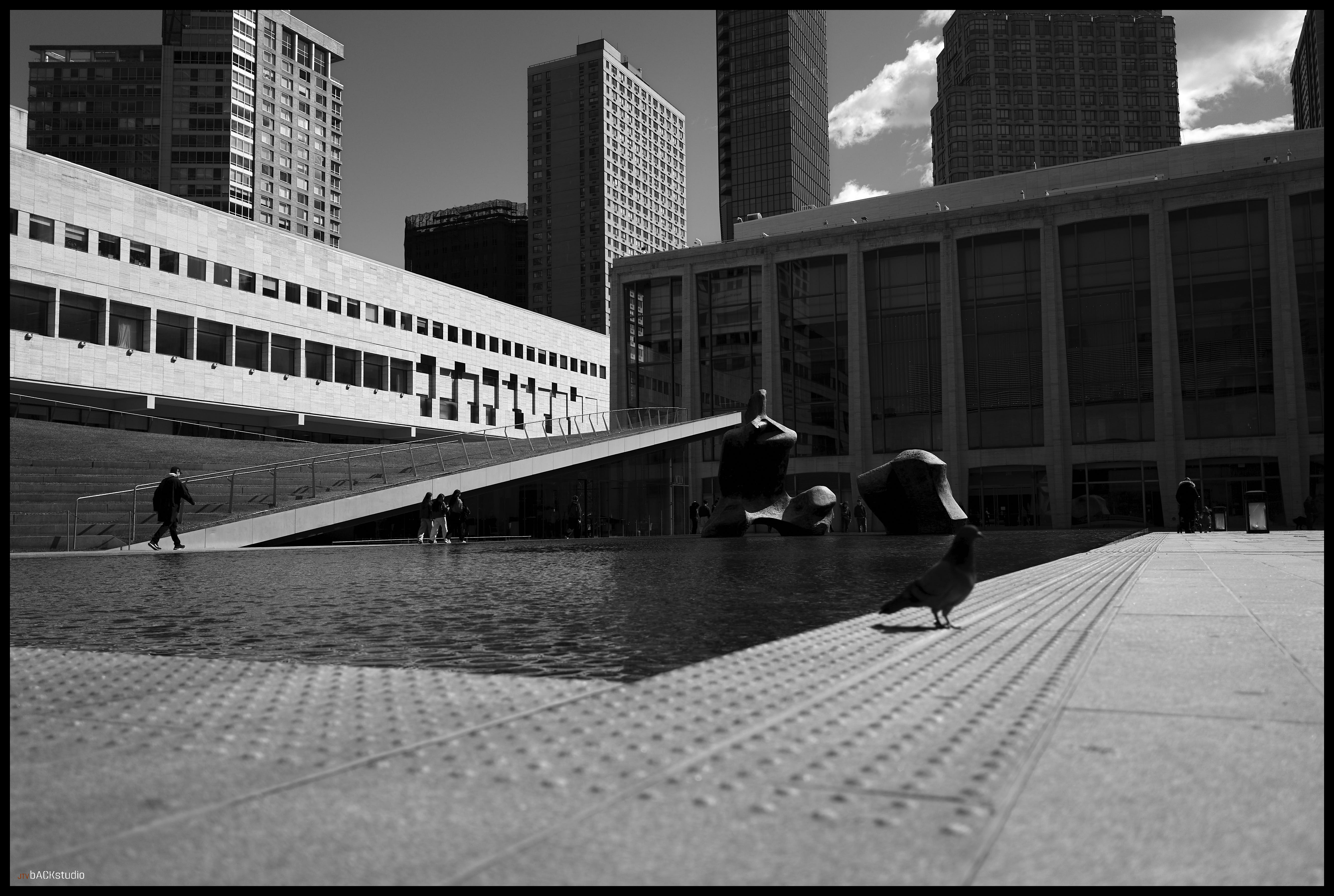 The bus arrived early, and as a result, left about 40 minutes to explore Lincoln Center and the surrounds of New York City. I chose to remain within the immediate area of the complex and examine street photography from the perspective of exploring architectural geometries and pedestrians in adjoining spaces. Color and black/white photos were used to create stark contrasts between facades, people, geometries and scale. Considering its simple symmetrical layout of buildings, there is much to be seen besides the performances at Lincoln Center. Its core is a series of three buildings, deceptively simple in configuration, which combine to create a dynamic interaction between the pedestrian and the geometry of space. Dynamics are further achieved by the elevation change from sidewalk to plaza, from landscape features and elements which must be negotiated by the pedestrian within the plaza, from multiple access points to adjoining streets and additional buildings on the Lincoln Center campus located off-axis but geometrically aligned with the orthagonal grid of the 3 main performance halls. they are temples, whether to American Exceptionalism or not, is left to your interpretation. They are not, however, innocent in their creation.