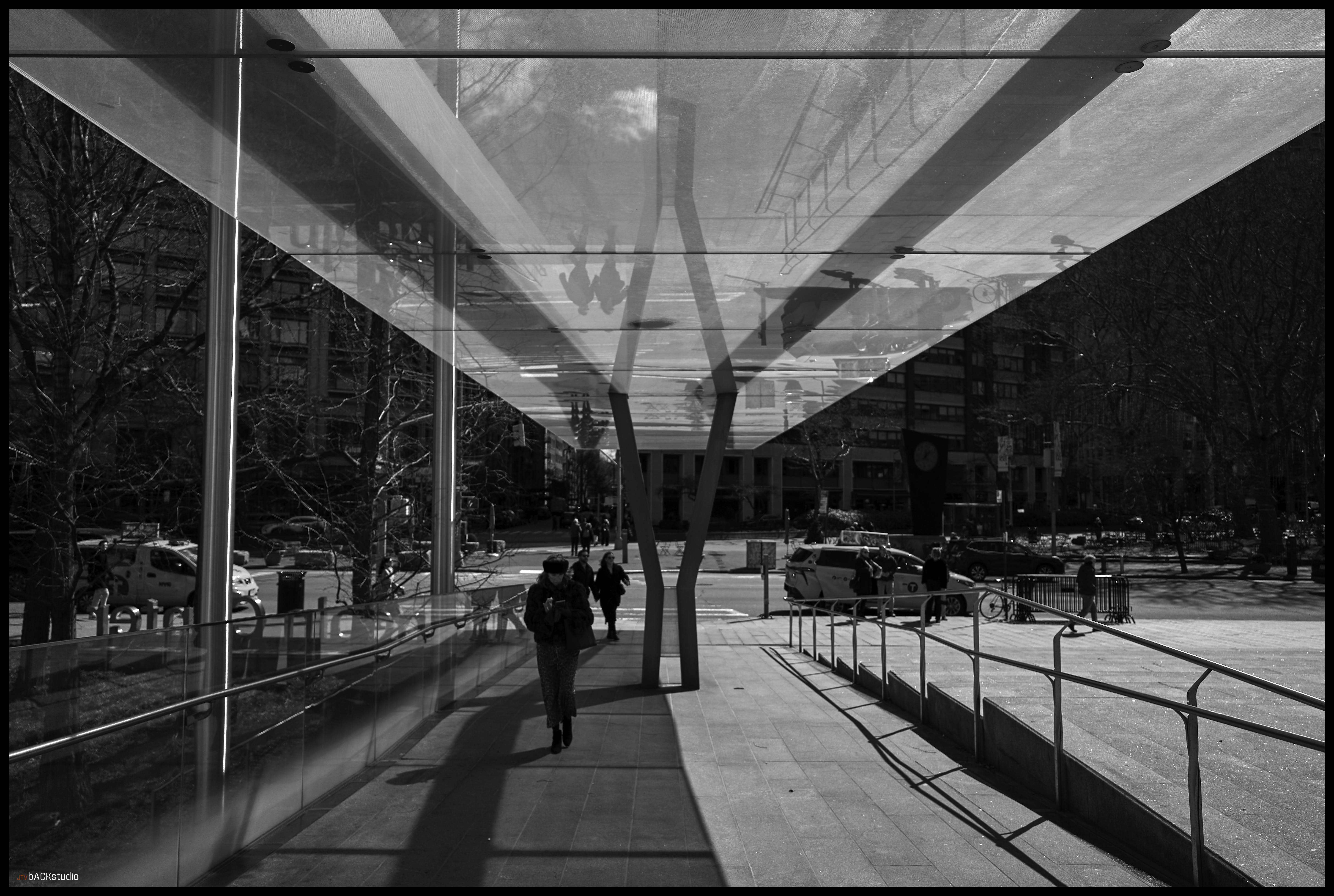 For the next set, I tried to intentionally incorporate color into the mix, using it to clarify the photo by providing additional information. The focus on these photos was to capture reflections, people, color, and angular perspectives to create a sense of scale, ambivalence, repose, dynamics, and perhaps, a revelation of what can be sometimes overlooked. How a pigeon can be isolated in such a busy public space. How a drained fountain can still provide reflection for those near it. How a canopy and building with simple geometries can create unique perspectives when viewed from below. The way a layered facade humanizes what would otherwise be a stark building facade.