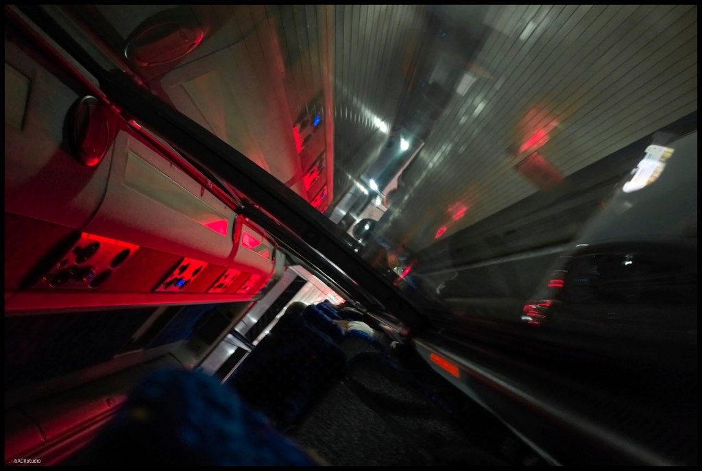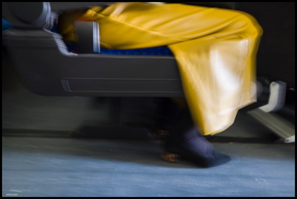 The interior shot of the skirt and shoes is a blur of movement while being seated, defying photographer’s and subject’s similar relative positions within the bus. What should be stationary isn’t. The two remaining photos incorporate internal and external scenes in the Lincoln Tunnel. The black and white photo only provides a focus in the very distance while the color photo captures the red lights reflecting in the bus’ interior, making them appear ominous. Madame Butterfly awaits.