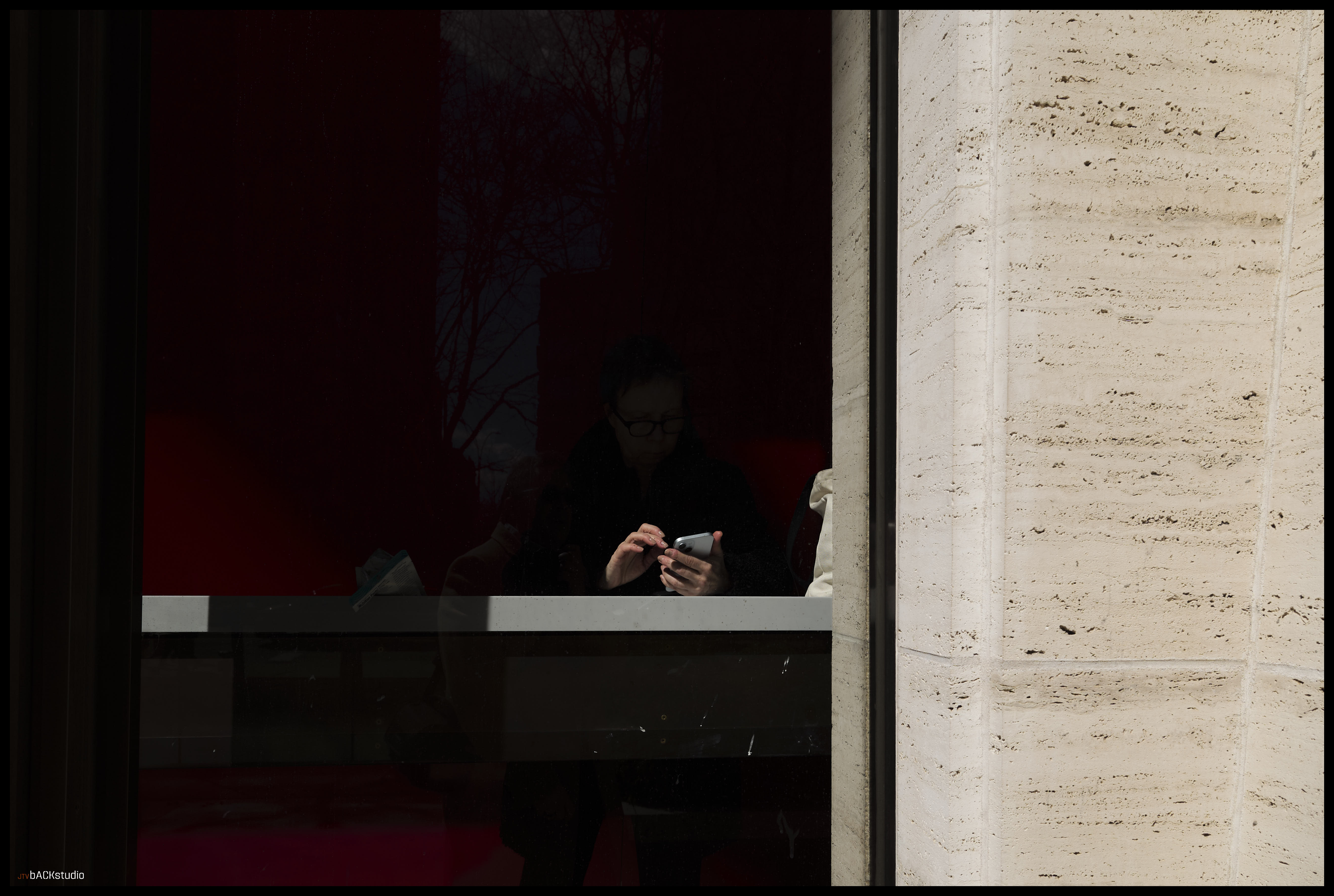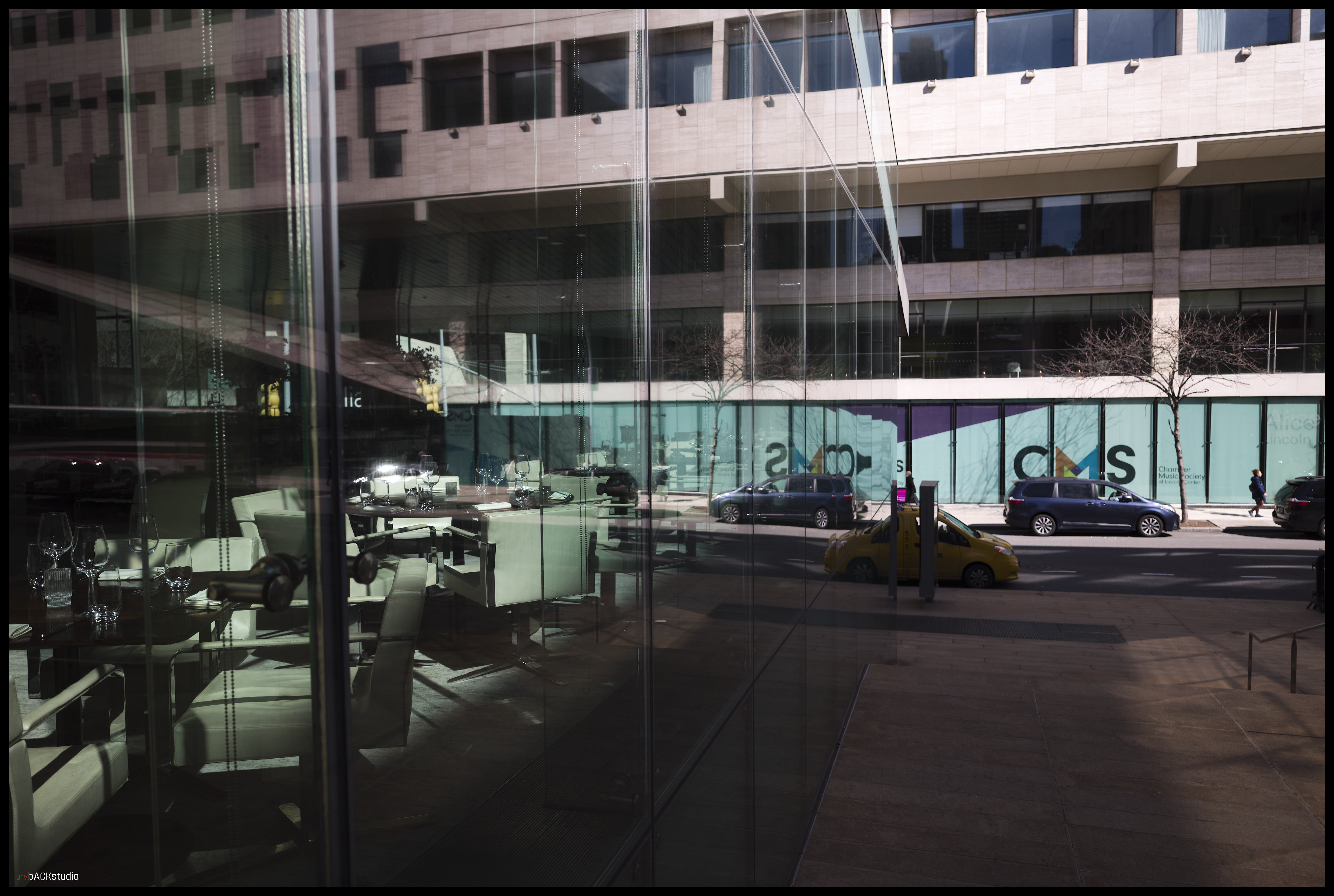 The same concept of static space and dynamic reflection is examined here from the exterior, in which all movement is frozen, with the exception of the eye of the viewer looking at the photograph. I loved the way the brutalist facade of the Julliard School continues into the restaurant above the Elinor Bunin Monroe Film Center. Think of the beautiful music that plays inside its walls. Think of the painstaking practice and repetition by these students. Reflect upon it…
