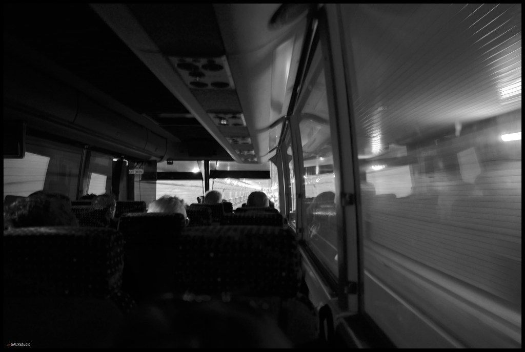 Act One: the bus. It was a large bus, which was never the plan. Space was supposed to be limited and the bus for the commute from New Jersey to New York was to be a smaller one. It turns out, the bus company made an executive decision to change buses which was never communicated to the organizers of the trip (surprise!). As a result of the larger bus size, I had my own seat to use and with it; the excuse to pull out my camera with a wide angle lens to capture confining space, expansive views and movement. Could the imagery outside the bus and inside the bus complement each other? Saul Leiter inspired reflections to the rescue…
